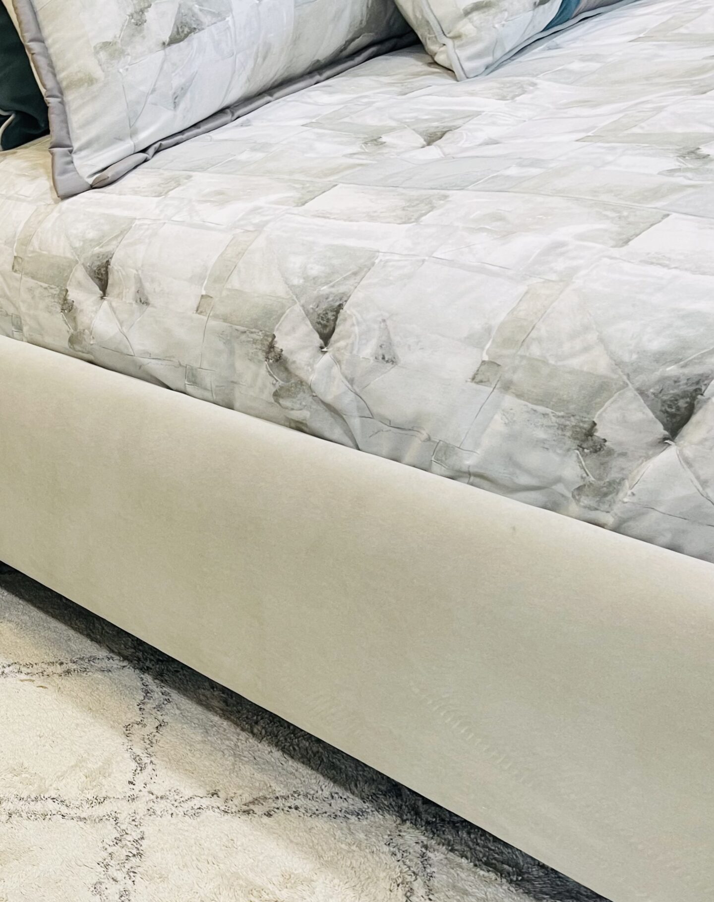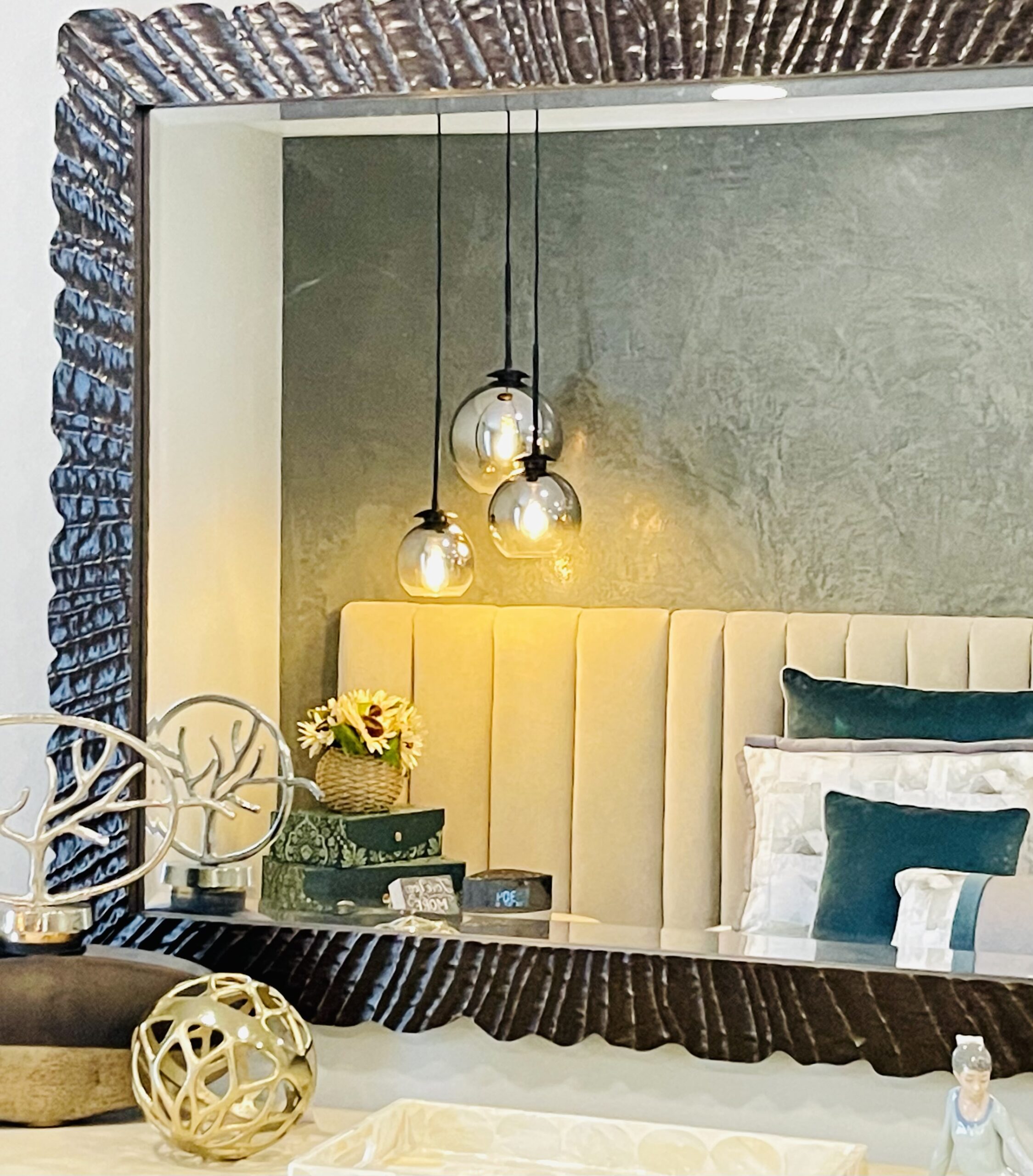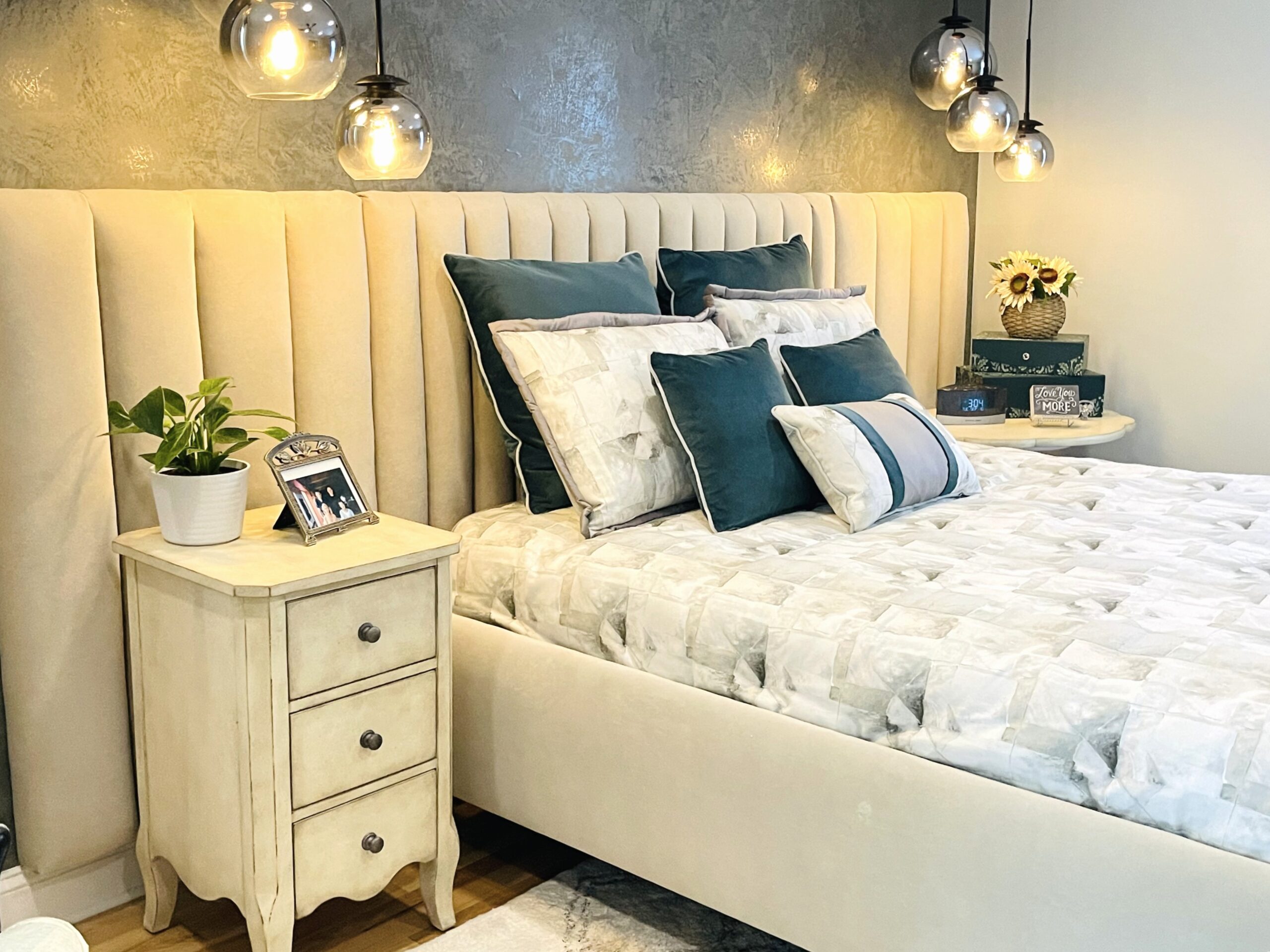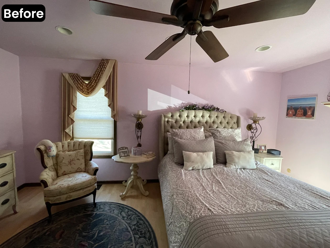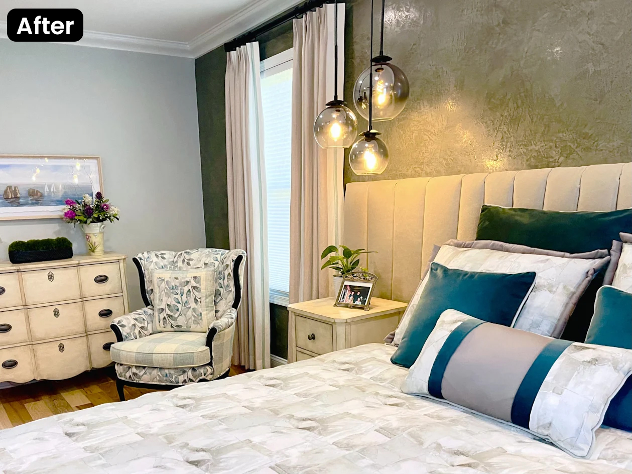 This comprehensive transformation included a custom upholstered headboard with a coordinating upholstered bed base, layered with bespoke bedding. The space was enhanced with decorative Venetian plaster and custom paint finishes, tailored window treatments, curated accessories and artwork, and reupholstered side chairs. Updates were completed with a new ceiling light featuring an integrated fan, rich new wood flooring, and a redesigned entry door—creating a cohesive, refined retreat.
