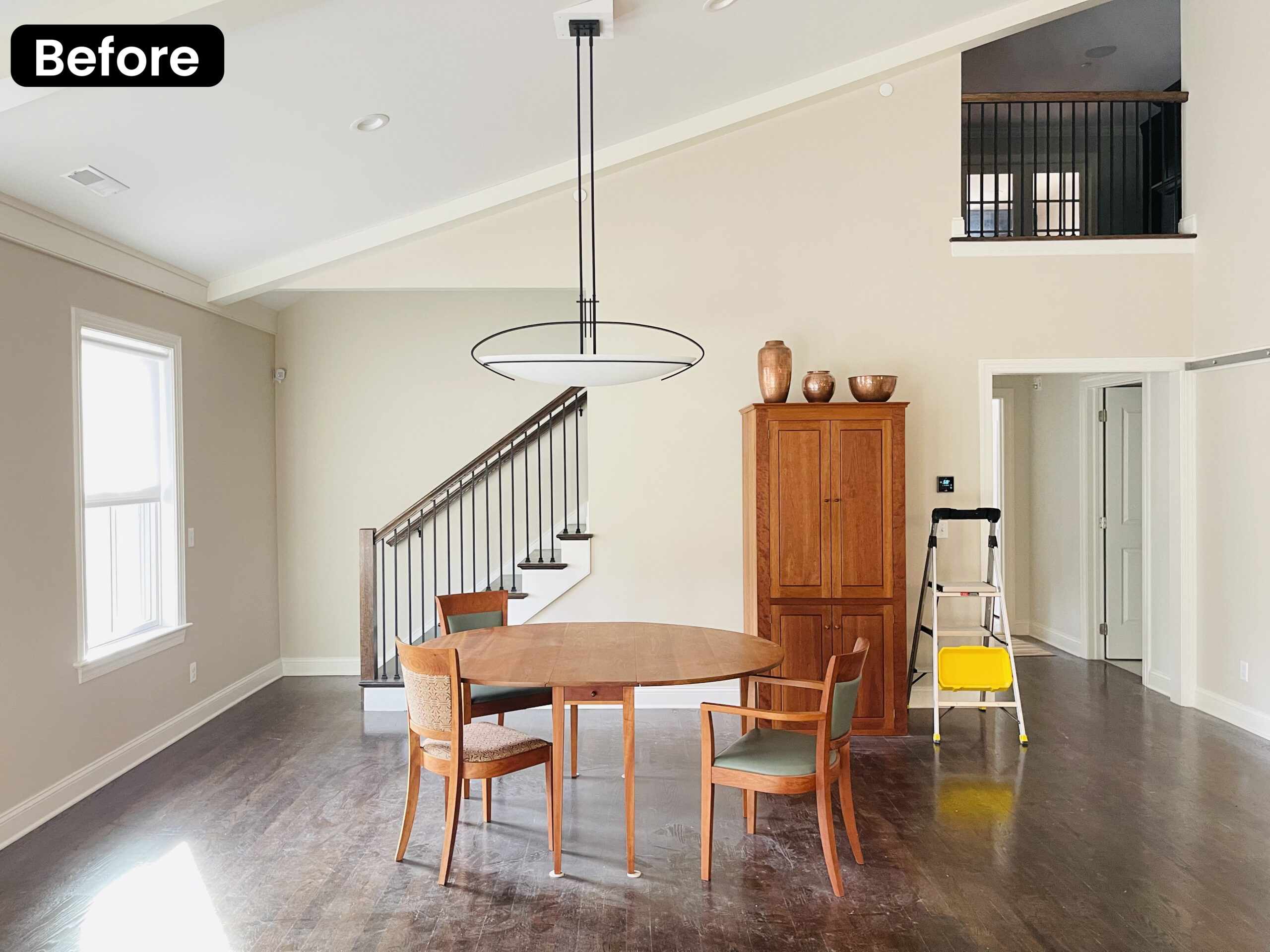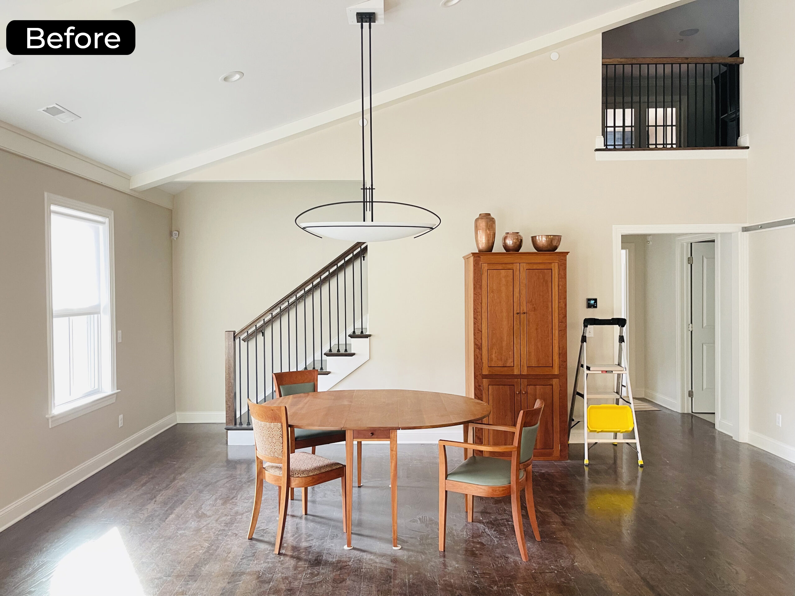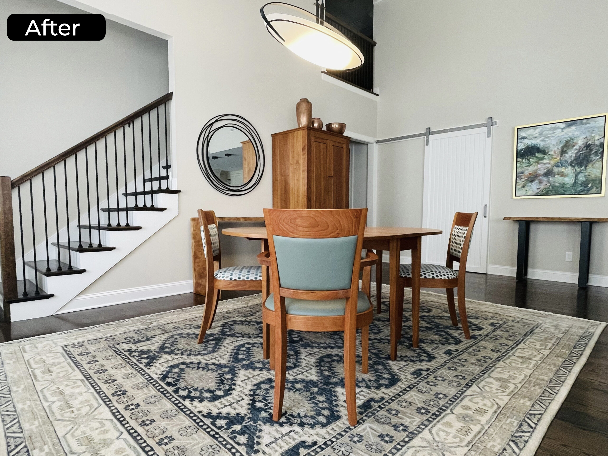 This dining elevation reflects Designhaus’ approach to refined, livable luxury. Clean architectural lines from the existing stair railing are softened by a centrally placed round mirror, creating balance and visual calm. Below, an artisan-crafted live-edge side table adds sculptural warmth and organic contrast, thoughtfully aligned to create symmetry with the tall wood cabinet opposite. A round wood dining table layered over a patterned area rug grounds the space with texture and ease. The composition is intentional yet effortless—where natural materials, proportion, and restraint come together in a timeless Designhaus expression.