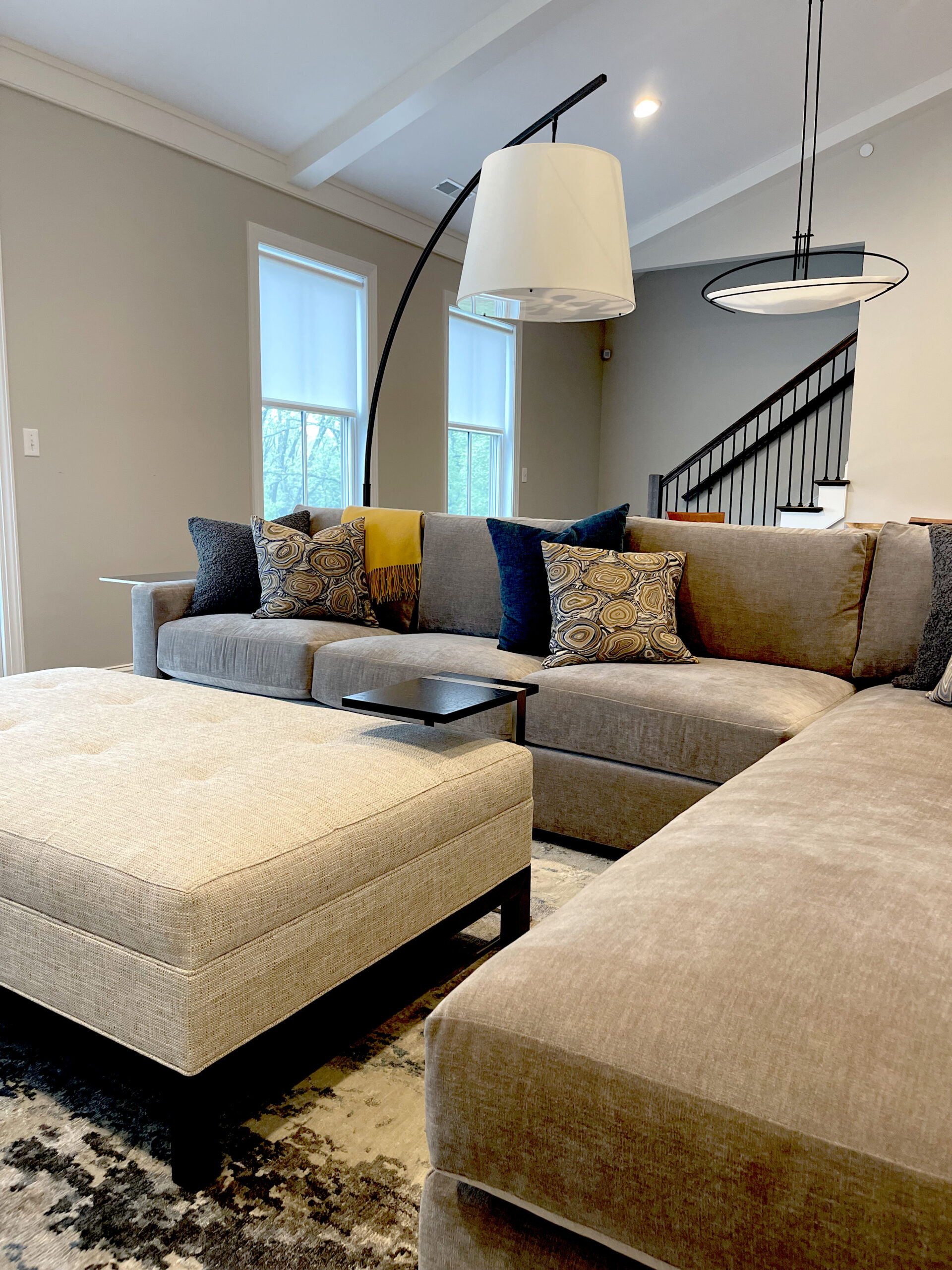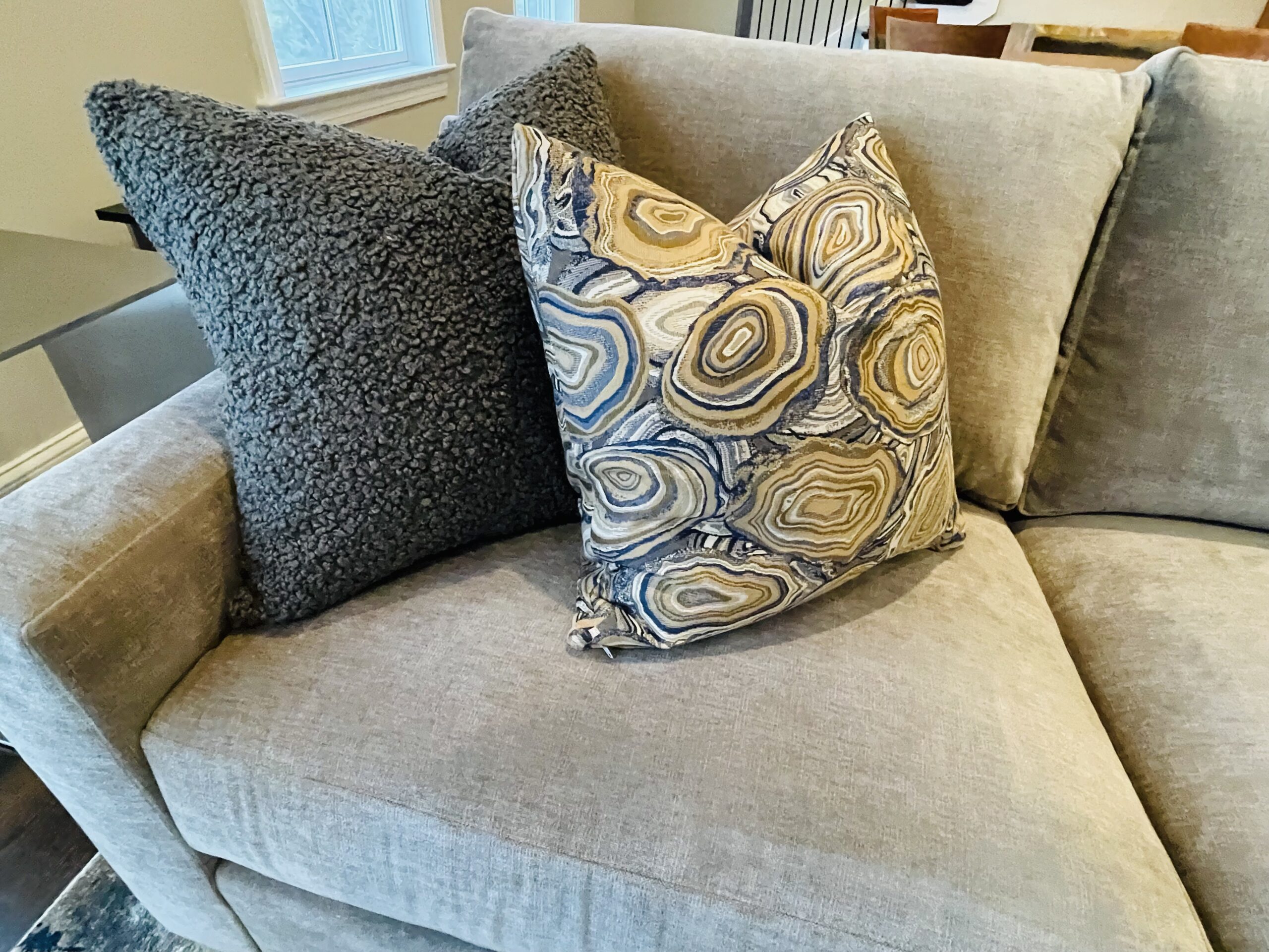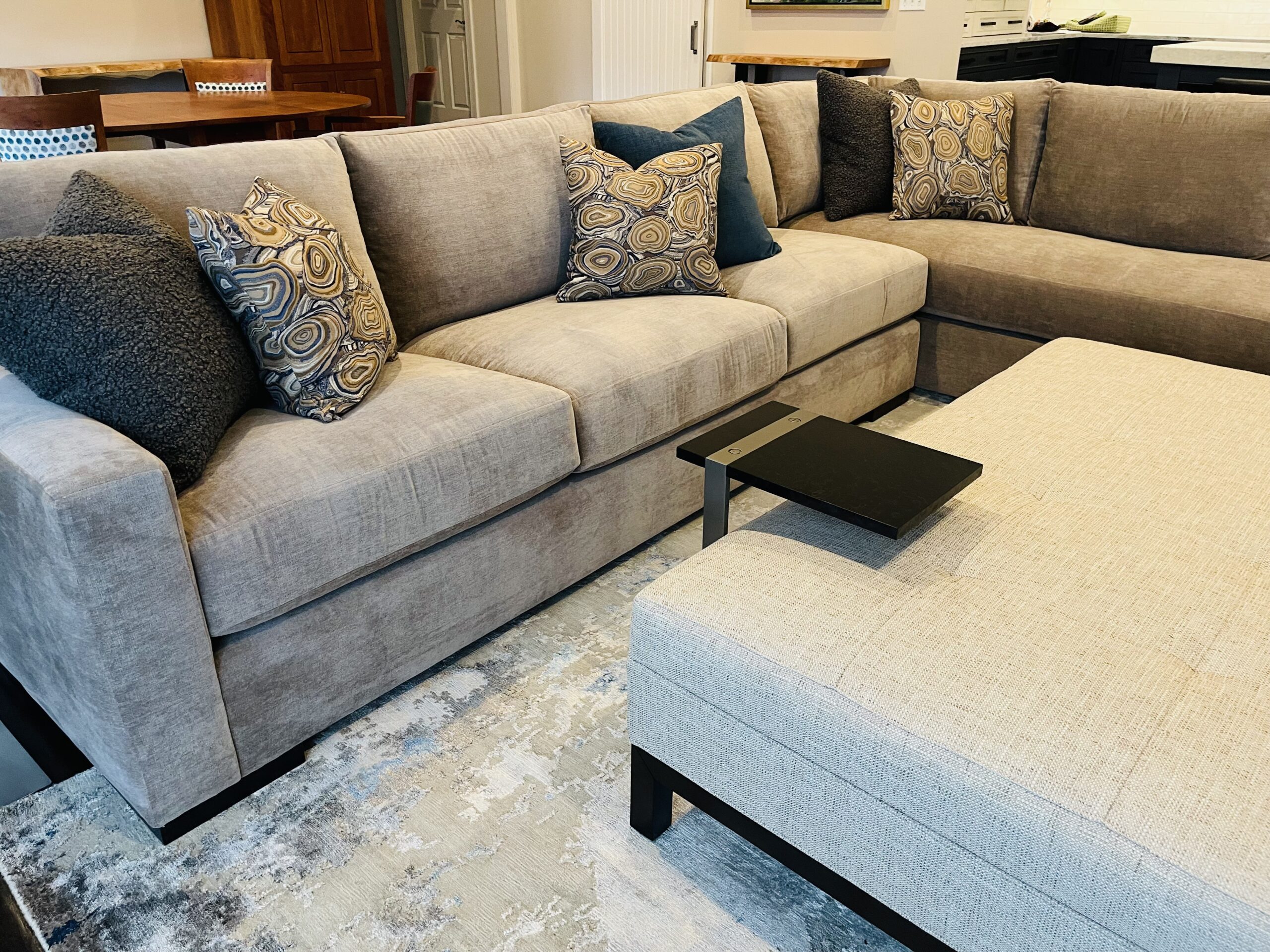 An elevated condominium retreat designed for a life well lived. Warm textures, thoughtful proportions, and timeless design details create a serene backdrop for relaxed days, meaningful moments, and a refined approach to retirement. The client envisioned a space anchored in comfort yet effortlessly elegant for entertaining—featuring inviting, tailored furnishings, calming grey tones, and subtle geometric patterns for visual interest. Dining chairs reupholstered in trend forward lighting add a sculptural edge, while a custom live-edge side console was thoughtfully introduced to complement the client’s existing William Morris–inspired tall cabinet, bringing warmth, character, and a touch of artisan craftsmanship to the space.